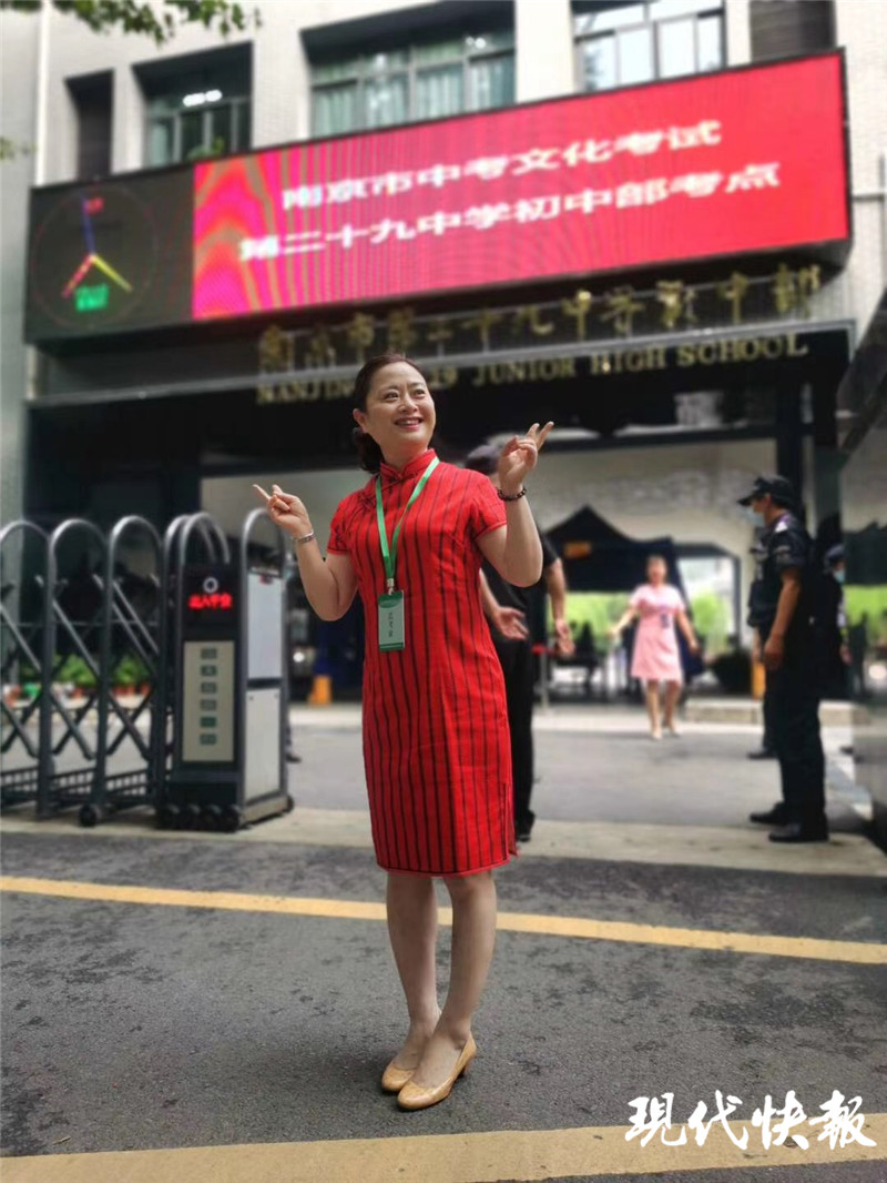 南京師范大學(xué)附屬中學(xué)樹(shù)人學(xué)校校長(zhǎng)孫小紅,一早就來(lái)到南京市第二十九中學(xué)初中部考點(diǎn)送考。她特意穿上豎條紋的紅色旗袍,祝愿考生們考試順順利利。