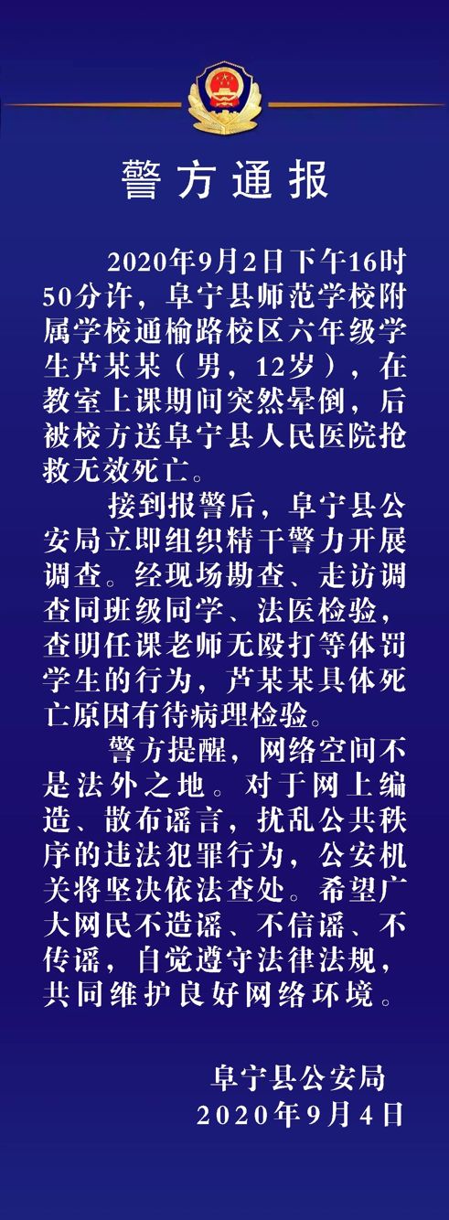 接到報警后,阜寧縣公安局立即組織精干警力開展調(diào)查。經(jīng)現(xiàn)場勘查、走訪調(diào)查同班級同學(xué)、法醫(yī)檢驗,查明任課老師無毆打等體罰學(xué)生的行為,蘆某某具體死亡原因有待病理檢驗。