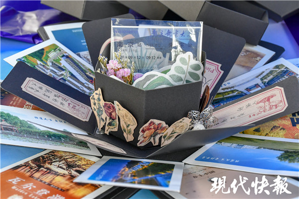 打開驚喜盒的第一層“致未來”,里面是給新生的大學(xué)四年的學(xué)業(yè)規(guī)劃、未來的職業(yè)等內(nèi)容的規(guī)劃書,學(xué)生可以用四年的時間來填滿空白處。第二層“致經(jīng)典”,里面有學(xué)院給新生推薦的閱讀書籍《中國文化史》《鄉(xiāng)土中國》《理想國》《疾病改變歷史》等書目及其簡介和一張讀書卡。第三層打開后,則是令人賞心悅目的校園經(jīng)典打卡美景。第四層里填滿了高年級學(xué)長手寫給新生的心里話“夢想就是夢里想的,醒來就能做的事。”“什么都不做,才會來不及。”揭開最上面的一層,有干花、花種和一張“南京站”到“未來站”的入學(xué)車票。