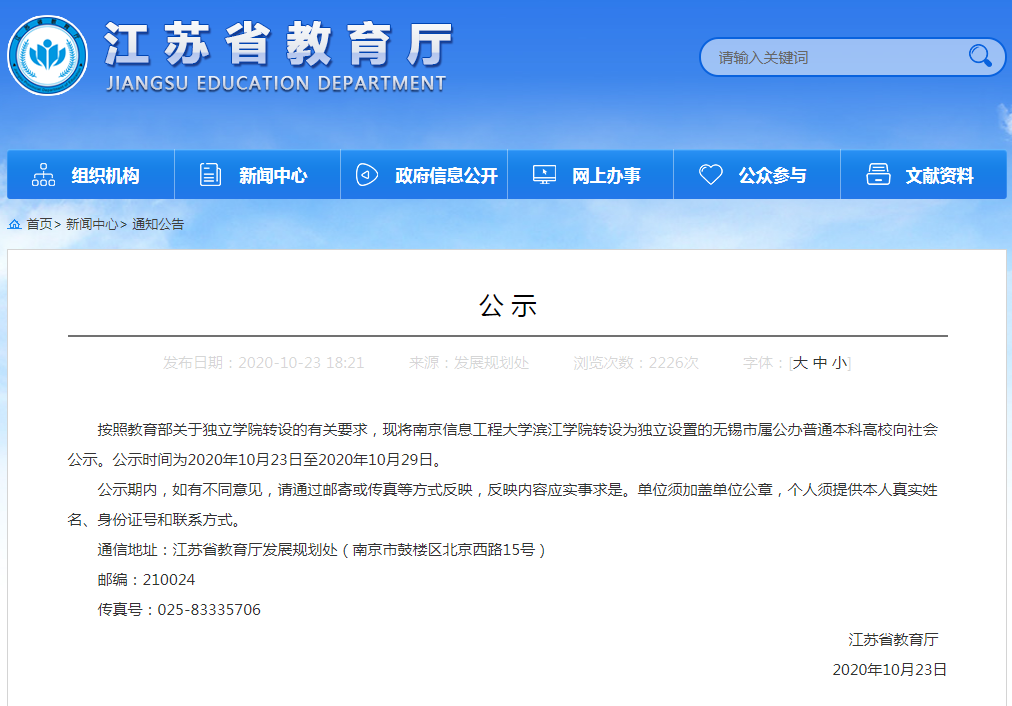 (記者 舒越)10月25日,現(xiàn)代快報記者從江蘇省教育廳官網獲悉,南京信息工程大學濱江學院將轉設為獨立設置的無錫市屬公辦普通本科高校,正在公示期,公示時間截至10月29日。這意味著江蘇省將新增一所公辦高校,也是繼江南大學之后,地處無錫的第二所公辦普通本科高校。