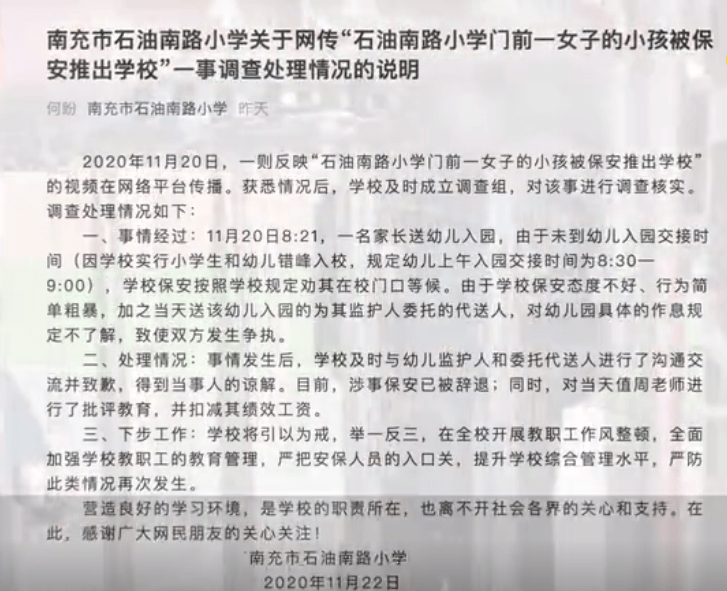 目前,涉事保安已被辭退,同時(shí)對(duì)當(dāng)天值周老師進(jìn)行了批評(píng)教育,并扣減其績(jī)效工資。