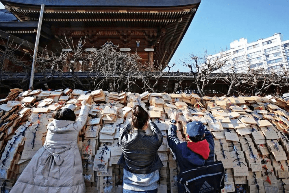 ▲ 在日本東京的湯島神社,人們在許愿墻上掛祈福木牌,為學生考試祈福