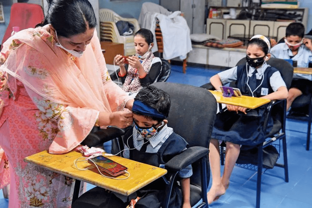 ▲ 10月17日,印度孟買的一名教師幫一名參加網(wǎng)絡課程的學生戴耳機