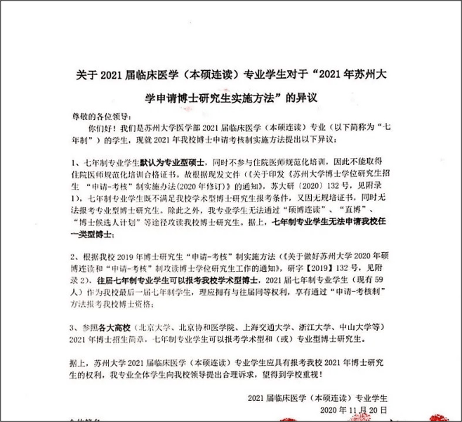 近期,一份名為「關(guān)于 2021 屆臨床醫(yī)學(xué)(本碩連讀)專業(yè)學(xué)生對于 2021 年蘇州大學(xué)申請博士研究生實施方法的異議」的 PDF 在網(wǎng)上流傳。