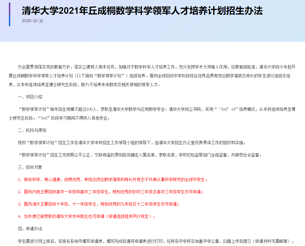 附:《清華大學(xué)2021年丘成桐數(shù)學(xué)科學(xué)領(lǐng)軍人才培養(yǎng)計(jì)劃招生辦法》
