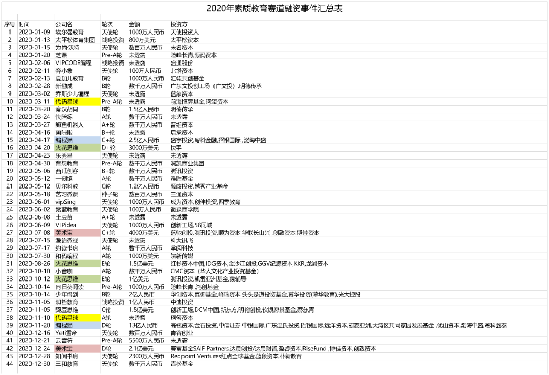 政策頻頻利好,但賽道并沒有因此火爆異常。根據(jù)公開信息統(tǒng)計(jì),2020年,素質(zhì)教育賽道共披露融資事件44起,融資總額共計(jì)72.41億元。