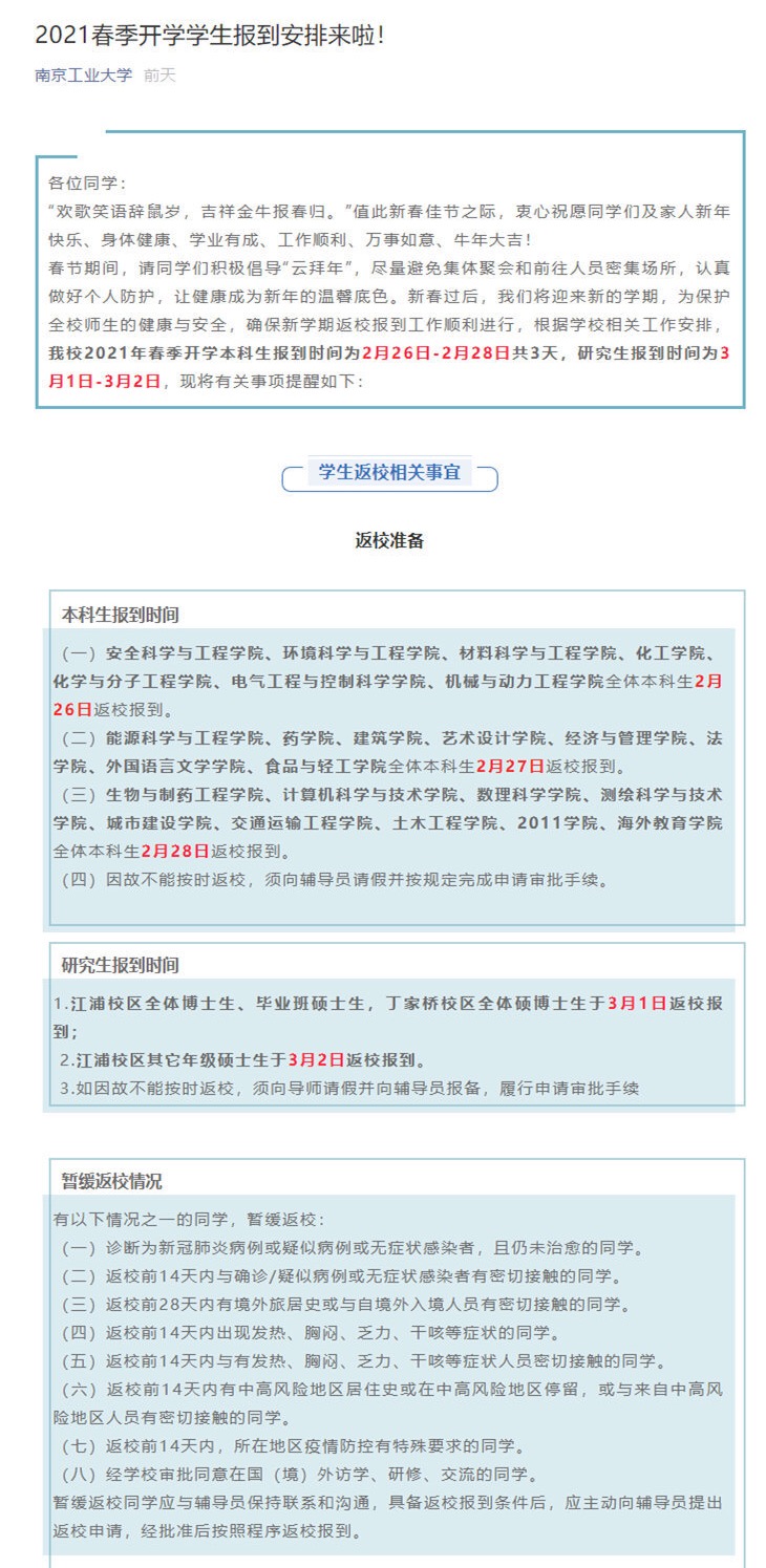 南京工業(yè)大學(xué)要求本科生按照學(xué)院分別于2月26日、27日、28日返校報(bào)到。揚(yáng)州大學(xué)明確,學(xué)生將于2月27日—28日分期分批、錯(cuò)時(shí)錯(cuò)峰返校報(bào)到,3月1日正式上課。江蘇大學(xué)要求,學(xué)生于2月25日至28日按照指定的批次、時(shí)間和返校方式錯(cuò)峰返校,3月1日正式上課,具體返校方案由學(xué)生工作組負(fù)責(zé)點(diǎn)對(duì)點(diǎn)通知到每一位學(xué)生。