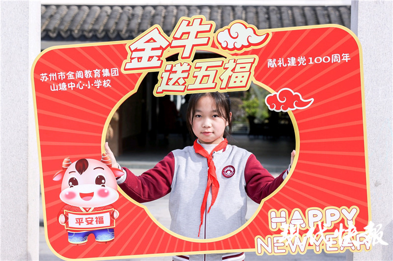 2月22日上午8點20分,一場別開生面的開學(xué)典禮在蘇州市金閶實驗小學(xué)的操場上舉行,百名師生齊上陣拼成了一個“牛”字,每個人手上拿著一幅自己親手寫的福字,從高處俯看,一個超級大的“福牛”喜氣盈盈。