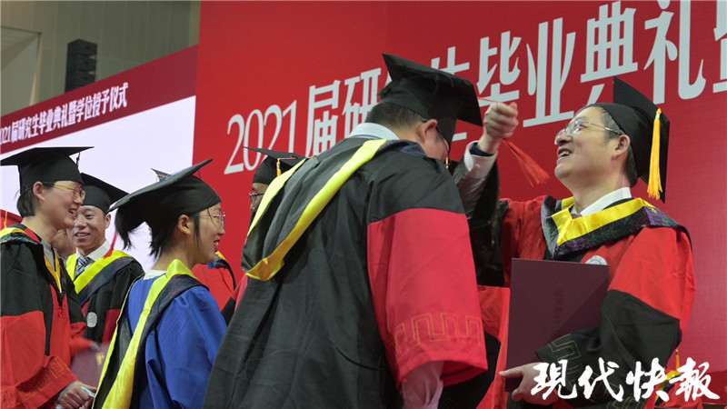 典禮上還舉行了2021年“良師益友——我最喜愛的導(dǎo)師”頒獎儀式。在學(xué)生寫給導(dǎo)師飽含深情的頒獎詞宣讀聲中,獲獎導(dǎo)師們走過紅毯,接受學(xué)生們的鮮花與祝福,師生們親切擁抱互道祝福,十分溫馨。