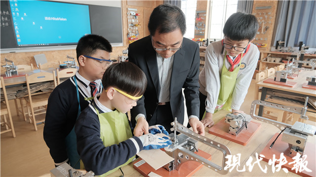 除了閱讀,維揚實驗小學還特別打造了500平米左右的STEM科創(chuàng)中心,內設小魯班木工坊、科學實驗室、教師交流區(qū)等,此外,學校根據各年級學生的特點自主開發(fā)了STEM系列課程,如《拯救小鳥》《智能灌溉》《智慧大棚》等,同時在班級層面建立以科學家名字命名的少科所,截至目前,學校學生共獲得了57項國家發(fā)明專利,有1000多人次獲省級以上科技競賽獎項。