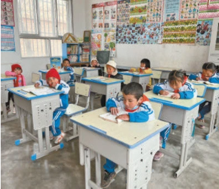 2017年,隨著易地扶貧搬遷政策的落實,越來越多村民選擇搬到山腳開始新的生活。學(xué)校里的孩子們由32名減少到9名。“9個孩子有7個是留守兒童,最大的8歲,最小的3歲。”完么仁增把黑板分成兩塊,左邊是一年級,右邊是學(xué)前班,“安排了語文、數(shù)學(xué)、美術(shù)、道德與法治4門課,采用復(fù)式班的教學(xué)模式”。