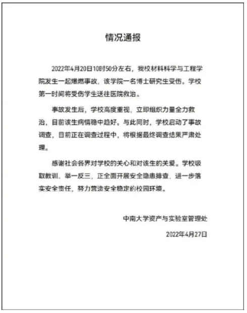 中南大學(xué)材料學(xué)實(shí)驗(yàn)室發(fā)生意外 博士被燒傷 天坑專業(yè)還能上嗎