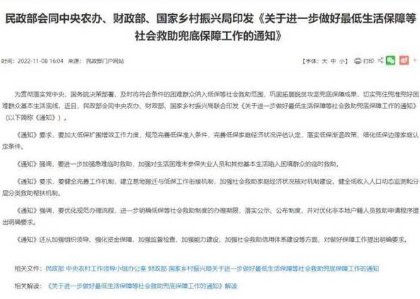 11月8日,民政部、中央農(nóng)村工作領(lǐng)導(dǎo)小組辦公室、財(cái)政部、國(guó)家鄉(xiāng)村振興局等四部門聯(lián)合印發(fā)的《關(guān)于進(jìn)一步做好最低生活保障等社會(huì)救助兜底保障工作的通知》(以下簡(jiǎn)稱《通知》)全文公布。