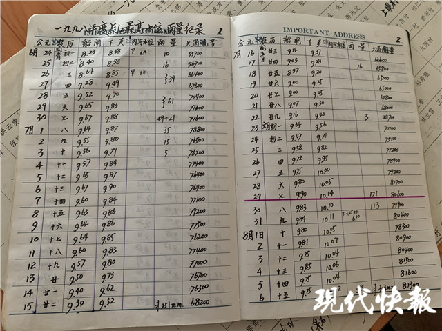 今年7月6日起,南京連降大雨,長江水位持續(xù)走高,八卦洲也投入大量防汛力量。這讓束祖正感嘆:“今年水怎么這么大呢?”于是,他將自己的防汛筆記翻出來查看。1998年時,八卦洲防汛工作持續(xù)了3個多月。束祖正的防汛筆記上,清楚地記著1998年6月24日至9月24日期間,每一天的長江船閘水位、長江下關(guān)水位、雨量、大通流量等。其中,他用紅筆標注出,1998年7月29日水位最高。束祖正將這份資料捐贈給了外沙村。外沙村工作人員看了受益良多,束祖正記錄的漲潮規(guī)律跟現(xiàn)在差不多。