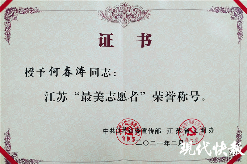 近日,中共江蘇省委宣傳部、江蘇省文明辦決定授予何春濤江蘇“最美志愿者”榮譽(yù)稱號(hào)。紅彤彤的證書(shū)拿在手上的那一刻,何春濤笑了:“老百姓需要我,我就一直做下去!”