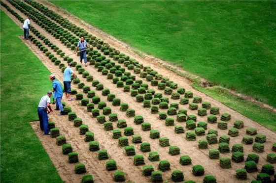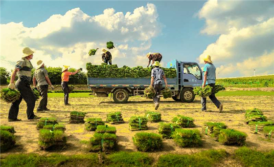 “點(diǎn)子”有了,出路在哪里呢?村“兩委”拿出對(duì)策。針對(duì)顧慮一,辦培訓(xùn)班,從農(nóng)院請(qǐng)專家培訓(xùn)和現(xiàn)場(chǎng)指導(dǎo);針對(duì)顧慮二,全體村干部帶頭種草坪,村委會(huì)和村民簽協(xié)議,化解村民銷售的擔(dān)憂;針對(duì)顧慮三,村“兩委”作出保證,“草坪種到那里,機(jī)耕路就修到哪里!”讓運(yùn)輸車直接開到草地邊。村“兩委”還有兩條承諾:一是沒利潤(rùn),免除種草的所有稅費(fèi);二是幫你銷,一年包銷一季,三塊二一方。“這比種糧食強(qiáng)多了!”一些村民像臘月里的蘿卜——“凍”了心,便和村委會(huì)簽訂協(xié)議。“干部甘為小草,群眾跟著種草”。一帶十、十帶百,當(dāng)年草農(nóng)就獲得大豐收,其他人看得真切,也紛紛開始種草。