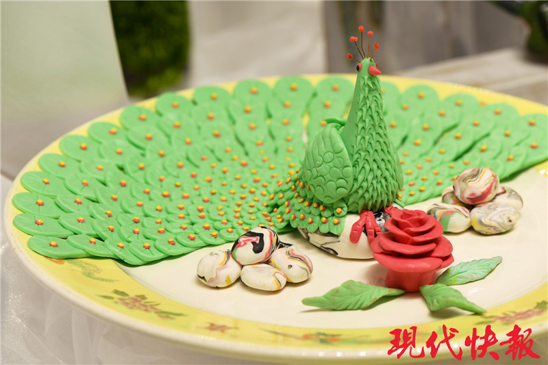 李增主要負(fù)責(zé)的是一道冷菜,菜名正是本次活動(dòng)的主題“水韻江蘇”。蓮葉田田,錦雞翹首,紅花綻放,取“錦上添花”的美好寓意,餐盤的右上角還有紫檀色澤的花窗,盡顯江蘇韻致。“這些畫面都是食材切成薄片疊起來碼放的,荷葉用的是青蘿卜,錦雞的羽毛是南瓜,花窗是方火腿。”聽了李增的介紹,記者湊近一看,才發(fā)現(xiàn),原來所有的圖案都不是擺件,而是薄如紙片的食材堆疊而成。