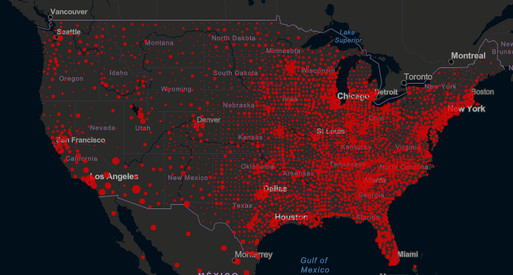 美國疫情分布圖(約翰斯·霍普金斯大學)