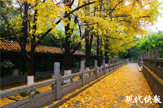 (通訊員 戚嫻馨 記者 陸文杰)又是一年銀杏黃。本周銀杏在冷空氣中變色,黃色、金黃色葉片蔚為壯觀,常州紅梅公園紅梅閣附近應(yīng)是龍城觀賞銀杏的最佳地點(diǎn),滿地金黃璀璨,與樹葉交相輝映,一年中最美的賞葉時(shí)機(jī)也正式來(lái)臨。紅梅公園里最老的一棵銀杏位于紅梅閣前,已有130歲,雖有百年樹齡,但仍然是枝繁葉茂,演繹著金色浪漫。觀賞銀杏葉落,已經(jīng)成為龍城市民初冬游覽的特色景觀。公園會(huì)將滿地銀杏葉保留半個(gè)月時(shí)間,為大家留住這一片溫暖的金色,有興趣的市民可以在接下來(lái)的半個(gè)月的時(shí)間來(lái)園觀賞。