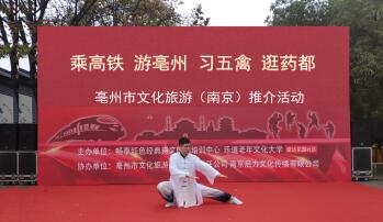 活動(dòng)現(xiàn)場(chǎng)亳州市文化旅游以主持人介紹、宣傳彩頁(yè)、圖片展示等形式向大家詳細(xì)的介紹了亳州市旅游景區(qū)的概況和交通優(yōu)勢(shì)。南京市旅行社代表向游客們推出了“從南京坐高鐵游亳州”的旅游產(chǎn)品,中國(guó)五禽戲傳承人陳陳給大家?guī)?lái)了精彩絕倫的五禽戲表演,使活動(dòng)推向了高潮。