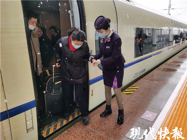 △ G1971次列車乘務(wù)員做好降雪天氣下旅客乘降引導(dǎo)工作 劉思雨 攝