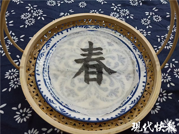 為了讓一家人的春節(jié)更有氛圍,陳正銀2月初就開始琢磨美食。“那天正好是立春,家里準(zhǔn)備了一些‘春’餅,我愛人在一旁寫毛筆字,我就突然來了靈感。”陳正銀想到,薄薄的“春餅”不就像宣紙嘛,宣紙上能寫字,在春餅上寫字會怎么樣?于是,他找來黑芝麻并磨成糊狀,在春餅上寫了個“春”字。“都說腹有詩書氣自華,把‘墨汁’吃到肚子里,新的一年也能收獲知識。”陳正銀很滿意這個作品。
