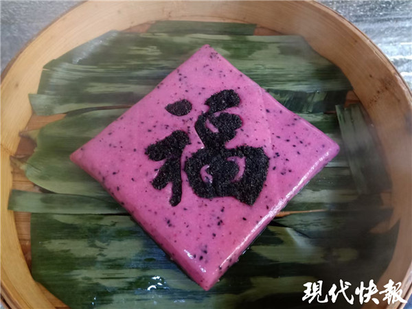 有了“春”餅的啟發(fā),陳正銀又開始做“福”糕。在用火龍果和糯米做成的年糕上,陳正銀借助模具用黑芝麻寫了一個“福”字。“我們中國過年最喜歡的字就是福,這個寫有福字的年糕,可以把福氣吃進(jìn)肚子里。”陳正銀說,為了保證福字上鍋蒸后仍不變形,火候和時間的把握很關(guān)鍵,需要多嘗試才能掌握技巧。