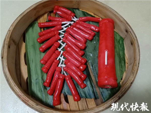 除了“春”餅和“福”糕,陳正銀還制作了可可愛愛的“氣氛組”糕點。“今年是牛年,我就用南瓜、糯米和可可粉,做了一籠小金牛,健康好吃還有節(jié)日氣氛。”陳正銀告訴記者,其實他每年都會結(jié)合當(dāng)年的生肖,做成糕點,今年已經(jīng)是第十年了。此外,陳正銀還用糯米和紅色的食用色素做成”鞭炮”,給春節(jié)增添熱鬧。