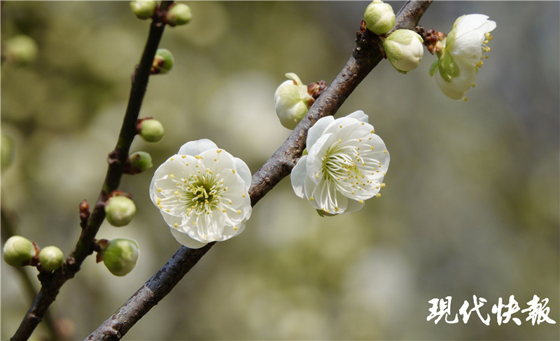 除了早中花品種均已開放外,部分罕見珍稀的綠萼梅也開花了。綠萼以其花色純白,萼片純綠,非常靚麗。高建華說綠萼是較為名貴的梅花品種之一,在梅花山上有大量種植,其中還有近百年的古梅,市民游客都有機會看到。