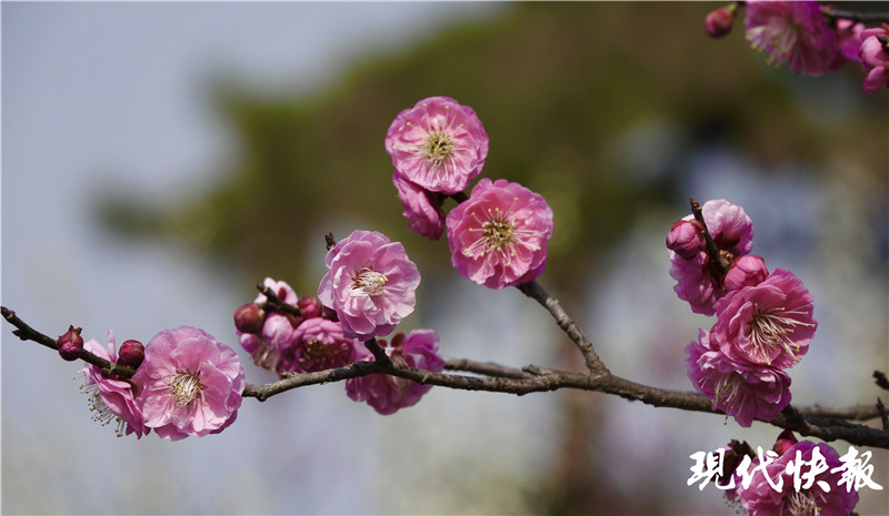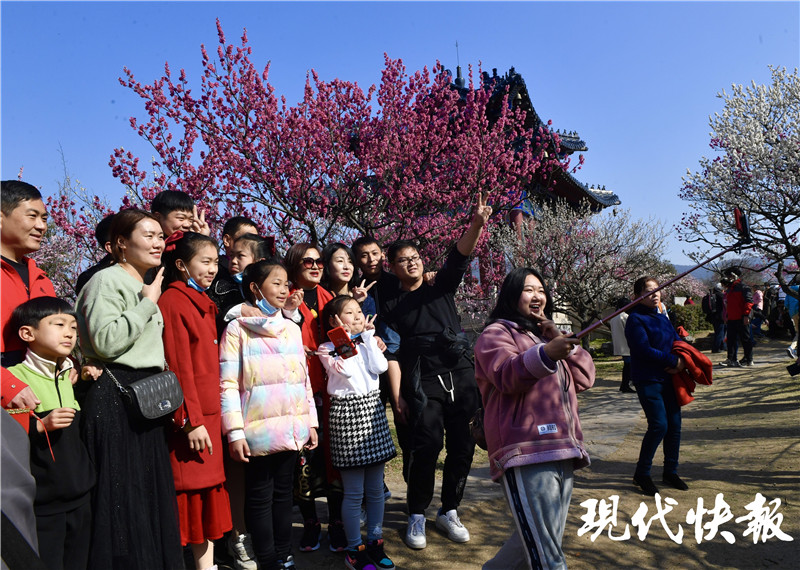 2月19日,現(xiàn)代快報記者來到梅花山,看到或粉或白的梅花盛放。市民游客紛紛拍照留念,笑靨如花。記者注意到,有不少是全家出動來賞梅的。