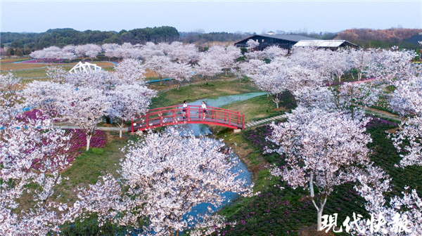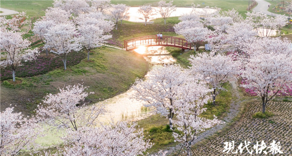 這兩天,鎮(zhèn)江句容白兔鎮(zhèn)伏熱花海里,大片大片的櫻花燦然盛開,以一樹的浪漫迎接四方游客。