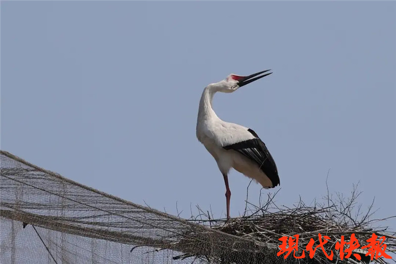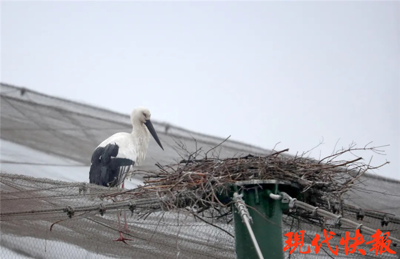 東方白鸛屬于大型涉禽,是國(guó)家一級(jí)保護(hù)動(dòng)物。2009年,全世界東方白鸛野生種群記錄不到3000只,屬于瀕危鳥(niǎo)類(lèi)。3月8日,現(xiàn)代快報(bào)曾報(bào)道,一只東方白鸛在遷徙途中,被南通森林野生動(dòng)物園內(nèi)的同族群吸引,自己在鳥(niǎo)籠頂部筑巢安家,天天與另一半“隔籠相望”。