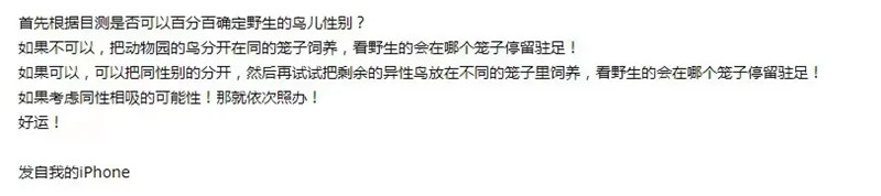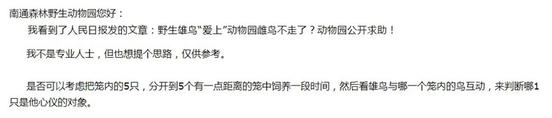 如何幫助這對(duì)隔籠相望的 “愛(ài)情鳥(niǎo)”?南通森林野生動(dòng)物園向社會(huì)發(fā)布求助信,希望借助專家和網(wǎng)友的力量,讓這對(duì)“小情侶”最終能走到一起。