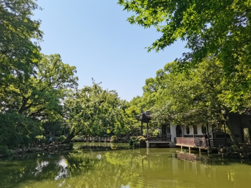 取歡仁智樂,寄暢山水陰。9日下午,蘇南區(qū)域40余名職工赴寄暢園共賞園林山水。穿過昏暗的園門和雙孝祠,一片蒼翠映入眼簾,園中景觀舒朗有序。及至含貞閣前,樹木郁郁蔥蔥,清風(fēng)徐徐,徹底沖淡了初夏暑熱。沿著小徑向前,步移景異,嘉樹堂、知魚檻、七星橋、涵碧亭紛紛映入眼簾。大家三三兩兩,置身于片片旖旎風(fēng)光之中,歡聲笑語夾摻雜著流水淙淙,一時心悅神怡。
