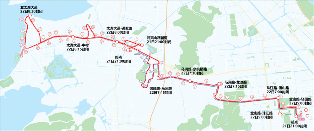 何山路(支英街至華楓路段)、何山路隧道、龍池西路(馬澗路至寒山路段)、馬澗路(馀杭橋路至龍池西路段)、馬澗路(錦峰路至馀杭橋路)、錦峰路(太湖大道至馬澗路段)、太湖大道輔道(嘉陵江路至健雄路段)、玉屏路(光啟路至景潤(rùn)路段)、太湖大道(貢山路至錦峰路段)、太湖大道(北太湖大道至貢山路段)、太湖大道(貢山路至嘉陵江路段)封閉屬于賽道的半幅路面,禁止所有車輛、非參賽行人在賽道內(nèi)通行。所有涉及賽道的道路(半幅或全幅)禁止車輛停放(含路內(nèi)停車泊位)。