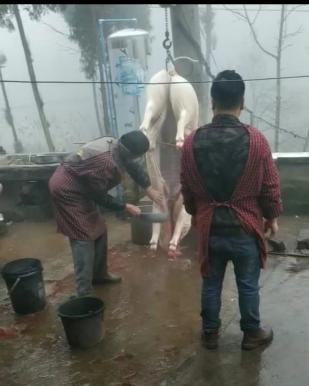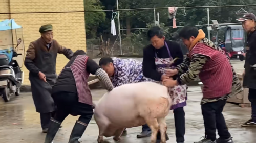 在快要過年的前一段時間,一般是在家里人都到的差不多的時候就會安排殺年豬。殺年豬的日子有講究。舊時有"殺七不殺八"的說法,逢亥日、亥時及逢陰歷"六、八"是不能殺豬的,一般都會選在適宜祭祀的日子進行。一般在殺年豬的前一天,就不再給"年豬"喂食了。殺豬是一門技術活,需要眾人的齊心協(xié)力。一頭300斤重的大肥"年豬",至少5、6名強壯的男子才能制服。寬敞的院壩邊上是殺年豬最佳的地點,砌一個土灶,燒一大鍋開水也是殺年豬的必備工作。殺豬時也有講究,必須"一刀斃命"。一方面是讓豬不受罪;另一方面,如果一刀捅下去沒死,或者豬掙脫了會被視為不吉利,主人家不高興是肯定的,對殺豬匠來說更是職業(yè)生涯的污點。