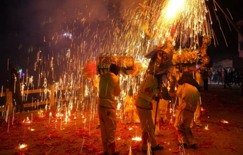 威遠縣新場鎮(zhèn)元宵燒九節(jié)龍的習俗從明朝開始流傳,每年正月十三開始,龍燈隊伍便走街串巷為鄉(xiāng)親拜年,祈年驅邪,各家則燃燭、奉糖果、放鞭炮、紅包等,元宵節(jié)“正燈”日,便是“燒龍”大戲上演之時。翔龍節(jié)出龍儀式,出動各種大龍、彩龍、脫節(jié)龍,花轎、軍鼓、花船、腰鼓、花棍等各種表演隊伍。不僅如此,這3天晚上還有燒龍和打鐵水花活動,當?shù)厝罕妼⒂醚婊鹱分殴?jié)龍“燒龍”,祈福來年風調雨順,國泰民安。
