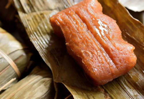 黃粑是瀘州地區(qū)老百姓非常熱愛吃的一種傳統(tǒng)小吃,其色澤金黃、香氣濃郁、味甜糍和。其制作方法是首先將大米和糯米打成米漿,再將剩下的糯米放入傳統(tǒng)的木甑中蒸煮到七八成熟。把打制好的米漿與蒸好的糯米飯倒入大木盆中再行混合,加入少量的紅糖或白糖,待米漿中的水分被糯米飯完全吸收,便可打成飯團并摔打成型。用洗凈晾干的良姜葉將成型的糯米飯團依次捆扎好,然后便可全部盛入大木甑中加火蒸煮了。剛蒸熟的黃粑香氣撲鼻,可直接食用;冷卻后,可切片油煎,或放入醮糟水內煮沸食用。一般在年前家里都會多做一點,一部分送給親戚,一部分留著過年時候吃。
