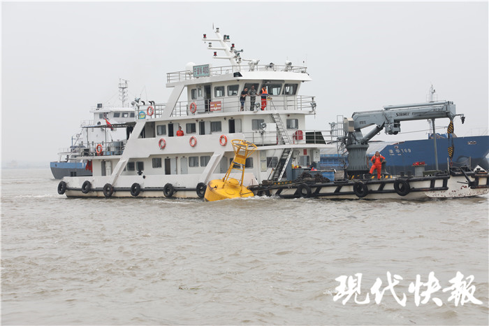 長航公安局南京分局儀征派出所水上巡邏艇在現(xiàn)場拉起警笛,同時通過喊話提醒過往船舶避讓。隨后,接到消息的南京航道部門南京寧道標403船舶也趕到現(xiàn)場,將儀化2號錨浮標筒固定在船舶旁,拖回長江儀征取水口水域進行固定,并將斷裂的纜繩連接上,消除了隱患。