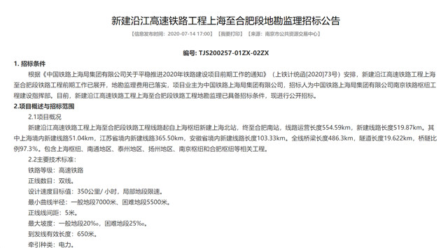 現(xiàn)代快報(bào)記者注意到,新建北沿江鐵路設(shè)計(jì)速度為350公里/ 小時(shí),局部地段限速。此次招標(biāo)內(nèi)容為線路地勘監(jiān)理,主要內(nèi)容為上海至合肥段定測、補(bǔ)充定測階段,補(bǔ)充勘察以及涉及改線、調(diào)跨等重大變更設(shè)計(jì)地質(zhì)勘察監(jiān)理工作。項(xiàng)目分為上海北至南京段、南京北(不含)至合肥南段兩個(gè)標(biāo)段進(jìn)行招標(biāo)。