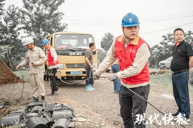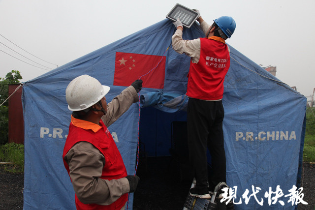 △供電工人為防汛執(zhí)勤點(diǎn)架設(shè)臨時(shí)用電設(shè)備