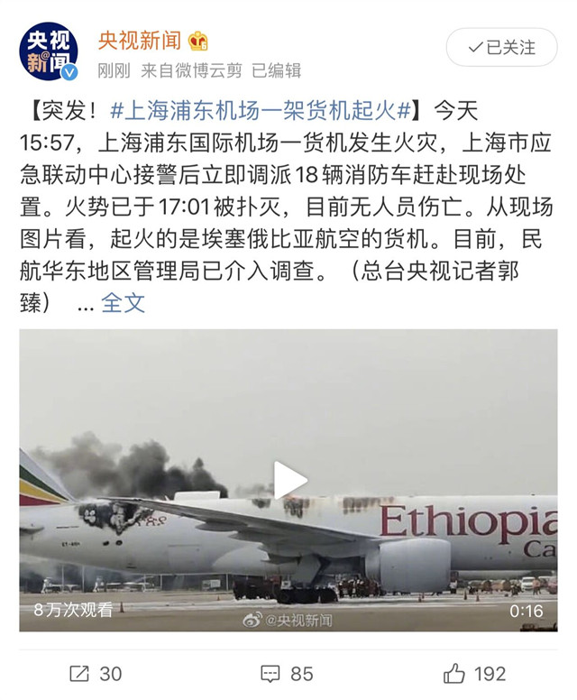 突發(fā)!上海浦東機(jī)場一架波音777貨機(jī)著火