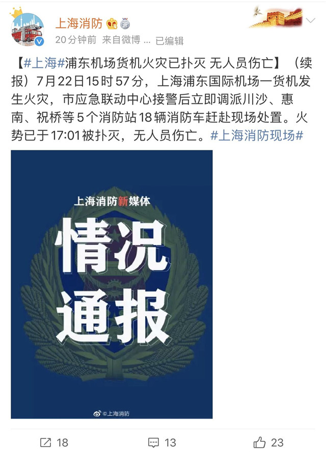 當(dāng)天下午,“@上海消防”發(fā)布稱,7月22日15時(shí)57分,上海浦東國際機(jī)場一貨機(jī)發(fā)生火災(zāi),市應(yīng)急聯(lián)動(dòng)中心接警后立即調(diào)派川沙、惠南、祝橋等5個(gè)消防站18輛消防車趕赴現(xiàn)場處置。火勢已于17:01被撲滅,無人員傷亡。