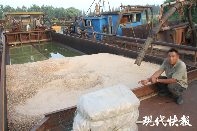民警與漁政工作人員商量后,兩條船艇相繼向前方駛?cè)?,近前才發(fā)現(xiàn)原來是兩條在駱馬湖采砂的船只,一條采砂船、一條轉(zhuǎn)砂船,兩條船捆綁在一起,此時(shí)采砂船因?yàn)楣收险脮和_\(yùn)轉(zhuǎn)。