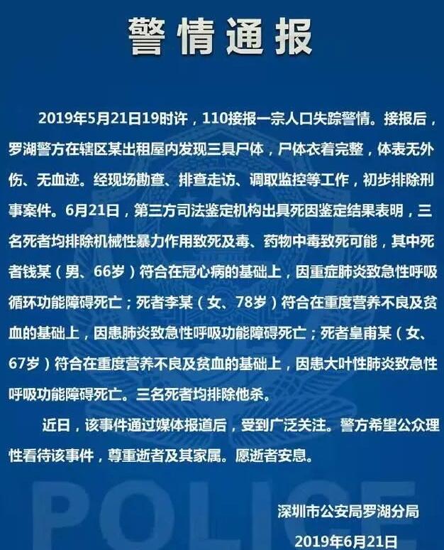 同年6月21日,羅湖警方發(fā)了一則警情通報(bào)稱,錢先生的父親符合在冠心病基礎(chǔ)上,因重癥肺炎致急性呼吸循環(huán)功能障礙死亡;錢先生的母親符合在重度營養(yǎng)不良及貧血的基礎(chǔ)上,因患大葉性肺炎致急性呼吸功能障礙死亡;錢先生的堂伯母符合在重度營養(yǎng)不良及貧血的基礎(chǔ)上,因患肺炎致急性呼吸功能障礙死亡。三名死者均排除他殺。