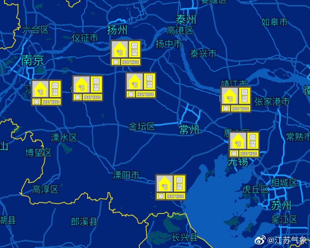 江蘇省氣象臺也于9時22分發(fā)布高溫黃色預(yù)警信號:預(yù)計南京、蘇州、無錫、常州、鎮(zhèn)江、揚州、泰州、南通地區(qū)未來連續(xù)三天最高氣溫將達35℃到36℃,提醒大家注意防范。