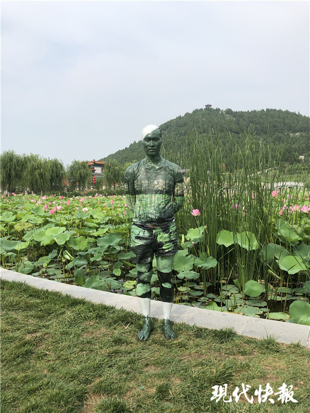 (記者 陸雨瀟)T恤、短褲、運(yùn)動(dòng)鞋,這是夏日里街頭常見(jiàn)的男士搭配,今年31歲的彩繪畫(huà)師王亮就經(jīng)常用這身穿搭,出入濟(jì)南周邊的各大景區(qū)。用丙烯顏料將大自然中的色彩繪遍全身、選擇合適角度、調(diào)整顏色構(gòu)圖……一番操作下來(lái),王亮仿佛電影里的“隱形人”一般,完美地融入自然。近日,王亮的“隱身”技能被網(wǎng)友們發(fā)現(xiàn),在他最近發(fā)布的一則自然彩繪視頻中,更是獲得了64萬(wàn)點(diǎn)贊。“人體變色龍”“隱形人”,網(wǎng)友們用一連串只在小說(shuō)和影視劇中聽(tīng)過(guò)的詞語(yǔ),來(lái)感嘆他高超的彩繪技巧。