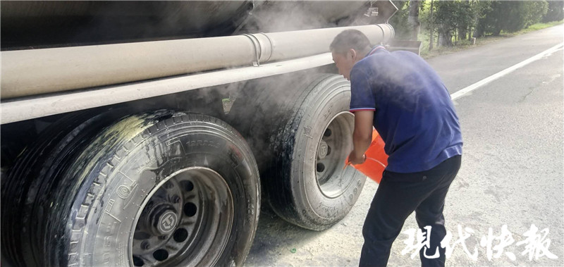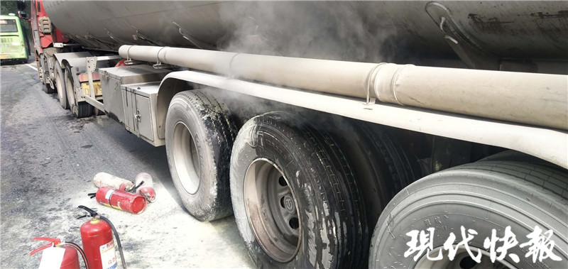 滿載汽油的油罐車輪胎起火 兩位大巴司機舍命撲救