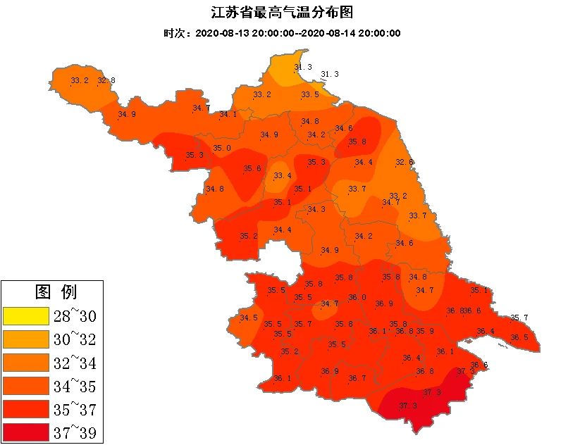 每天出門,戶外都是熟悉的“燒烤”氣息。8月14日,江蘇高溫線以上區(qū)域進(jìn)一步擴(kuò)大。全省37℃+以上的地方有3個,昆山、吳江、東山并列37.3℃。36℃+以上的有15個、35℃+的有24個,其他地區(qū)也紛紛向高溫線靠近。與13日相比,沿江蘇南地區(qū)基本升至35℃以上,高溫區(qū)占了全省一半。江蘇省氣象臺也繼續(xù)發(fā)布高溫橙色預(yù)警信號,全省基本被高溫預(yù)警包圍,蘇州、南通、無錫普遍發(fā)布高溫橙色預(yù)警。