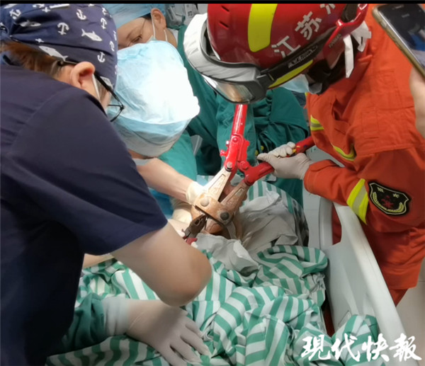 在醫(yī)護人員和消防員合作下,消防員拿起大力剪,只聽見“咔嚓”一聲,修腳刀被剪斷,幼兒被送往手術室進行手術。目前,幼兒還在進一步治療中。